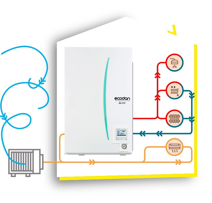 Funciona a través de una bomba de calor aerotérmica de última generación, la cual extrae el calor del aire exterior y lo transfiere al interior de un edificio para calentar el espacio o el agua.